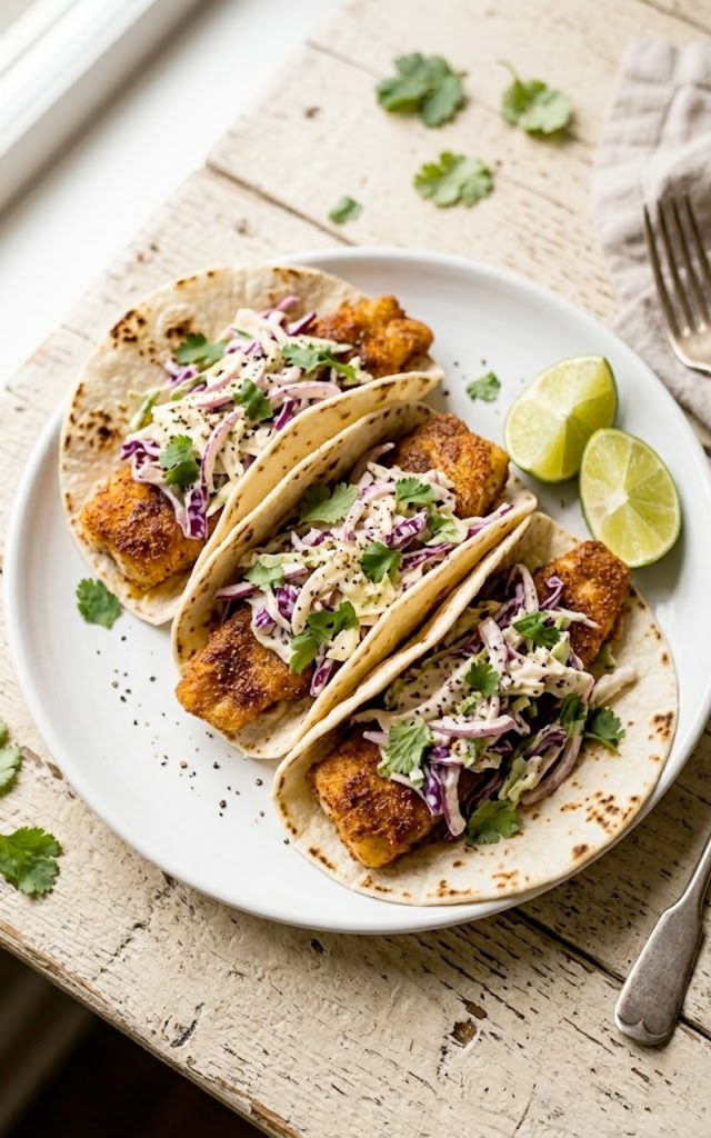 Assemble tacos with flaked fish, creamy slaw, fresh cilantro, and a squeeze of lime.