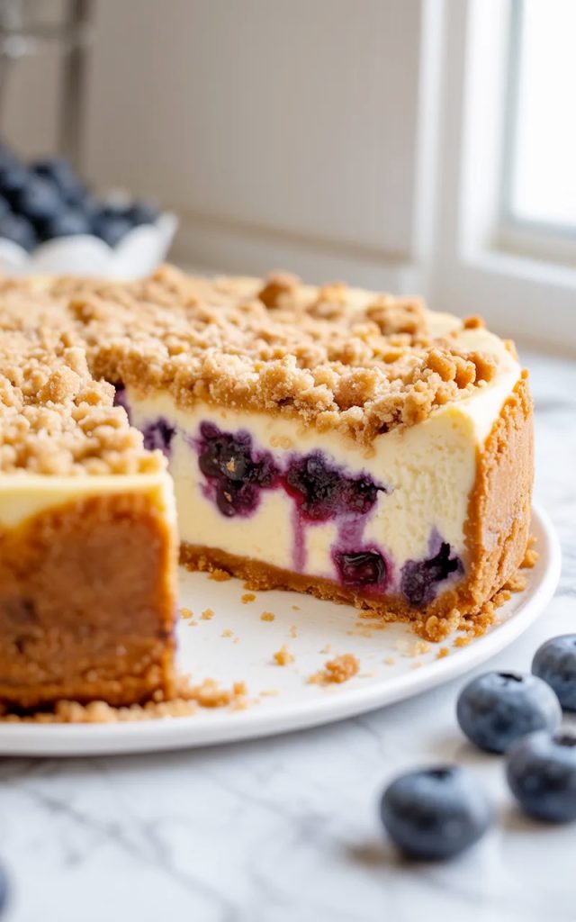 This blueberry crumble cheesecake is one of those recipes that I feel genuinely proud to share because it delivers on every level — visually, flavor-wise and in terms of the experience of eating it. The three layers each bring something essential to the whole and together they create a dessert that is more than the sum of its parts.