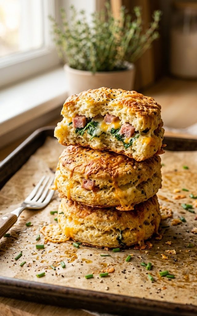 • The flavor combination is seriously good. Ham, sharp cheddar, and spinach together inside a buttery fluffy biscuit is one of those combinations that sounds simple but absolutely delivers. Every bite has something going on.