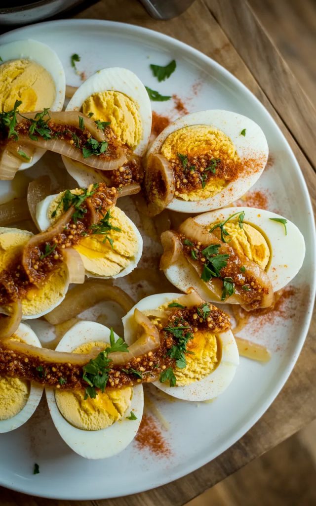 Arrange your halved boiled eggs on a plate or shallow bowl, cut side up. Spoon the spicy garlic butter sauce generously over the eggs, making sure each one gets some of that onion and garlic goodness.