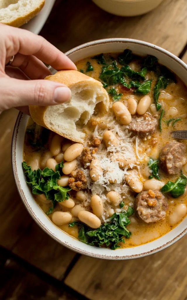 Ladle into bowls, top with freshly grated Parmesan, and serve with crusty bread for dipping. You’re basically required to drag that bread through the creamy broth—it’s the law.