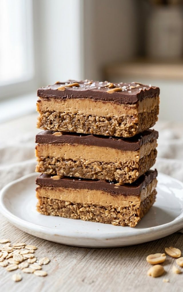 Mix peanut butter and powdered sugar until thick and smooth. Spread evenly over the chilled oat base.