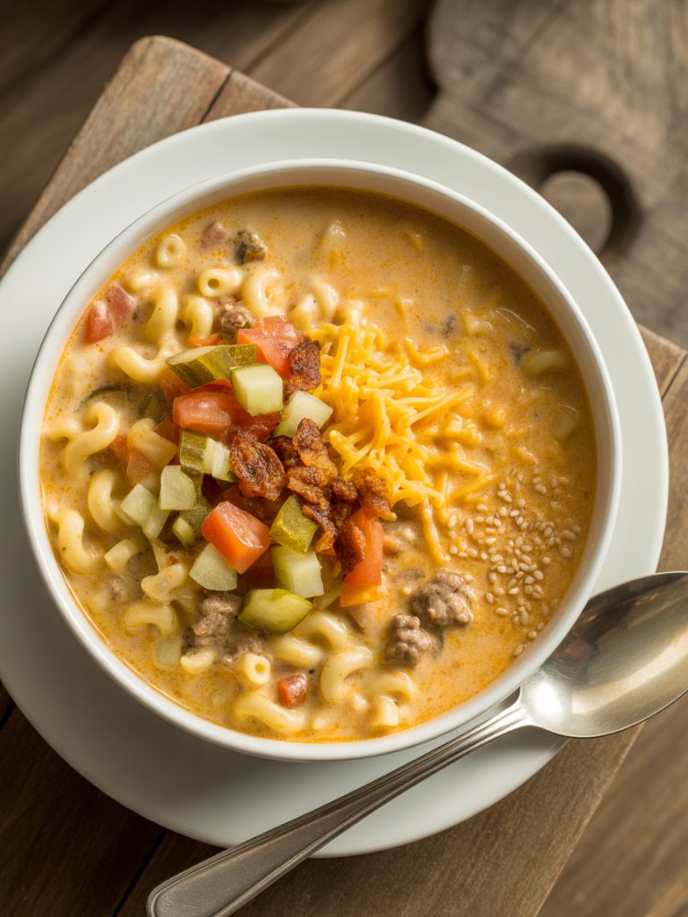 Turns out, combining cheeseburger flavors with soup is borderline genius. You get all the savory, cheesy, satisfying elements of a good burger, but in cozy, spoonable form. The macaroni makes it hearty enough to be a complete meal, and the melted cheddar creates this ridiculously creamy broth that tastes like liquid comfort.