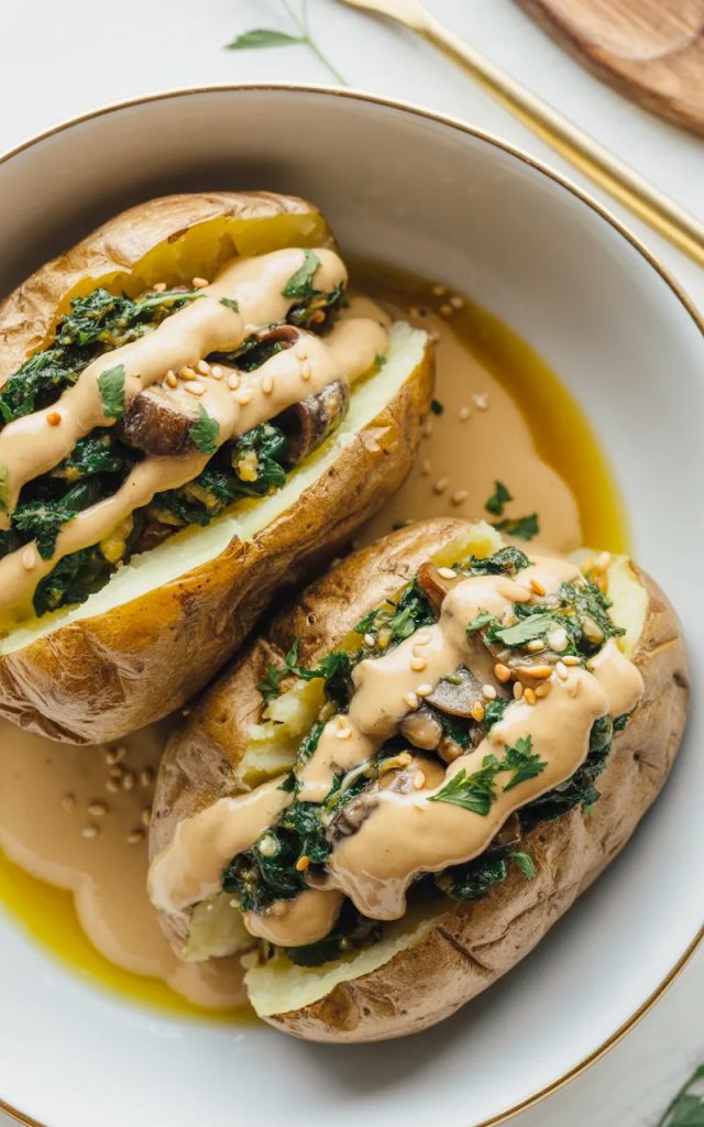 Let me tell you something about stuffed baked potatoes. They have absolutely no business being this good. A fluffy baked potato, split open and loaded with a savory mushroom and spinach filling, then drizzled with a warm golden tahini sauce — this is the kind of meal that makes you forget you’re eating something completely plant-based.