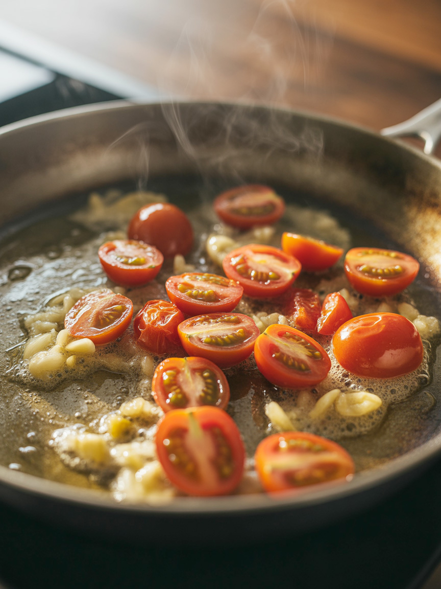 Add halved cherry tomatoes cut-side down. Cook for 2-3 minutes until they start to burst and caramelize.