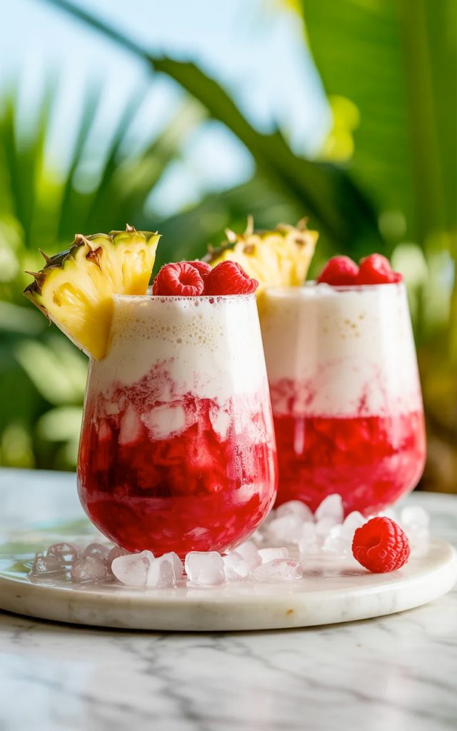 Place a few fresh raspberries on top of the colada layer and add a thick pineapple wedge to the rim of each glass. Serve immediately on a small bed of crushed ice for the full tropical presentation. Remind your guests to take a picture before they stir it — and then remind them how good it tastes once the layers combine.